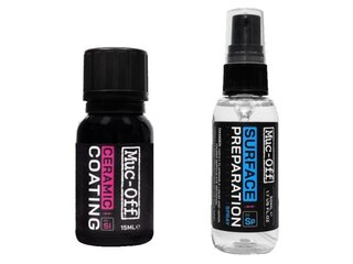 De Muc-Off Ceramic Coating is een keramische coating die geavanceerde, duurzame, met siliconen doordrenkte beschermlaag geeft. Deze coating hecht zich chemisch aan je lakwerk, waardoor er een hydrofoob oppervlak ontstaat. Dit betekent maximale water- en vuilafstotende eigenschappen, samen met UV-bescherming. Het biedt het behandelde oppervlak een pantserachtige bescherming tegen lichte oppervlakkige krassen. Het is in staat dit te bereiken omdat de coating de oppervlakte-spanning drastisch vermindert, wat het hele jaar door bescherming biedt aan jouw fiets door weer en wind.